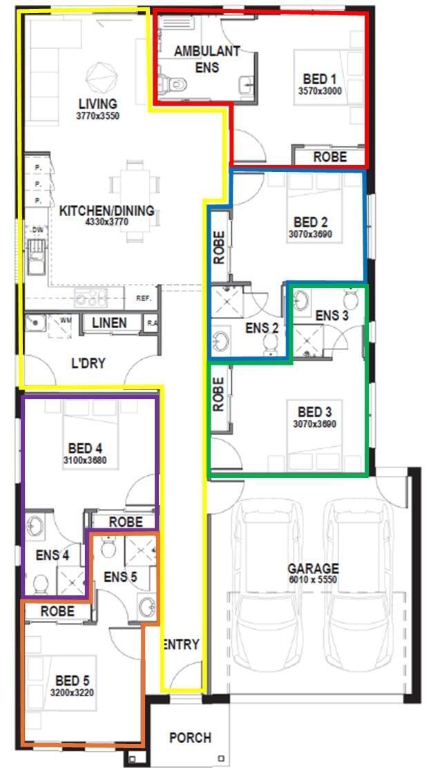 Each colour represents the space for each bedroom/ensuite/store. All have separate areas.